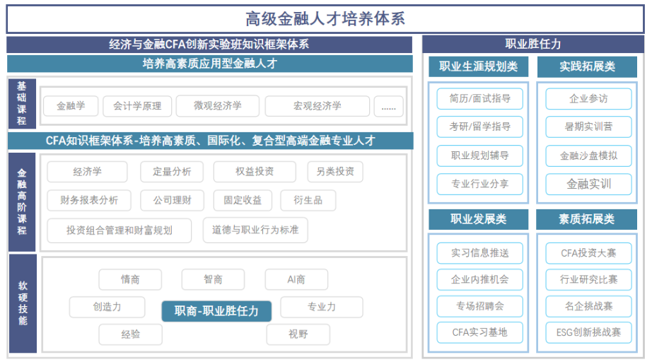 广东海洋大学经济学院经济与金融专业CFA创新实验班在保留经济与金融主干课程基础上,将CFA课程与经济与金融专业部分课程进行了有效替换和补充,并设置了贯穿大学四年丰富且多元化发展的学习实践活动,形成了特色鲜明的高级金融人才培养体系。